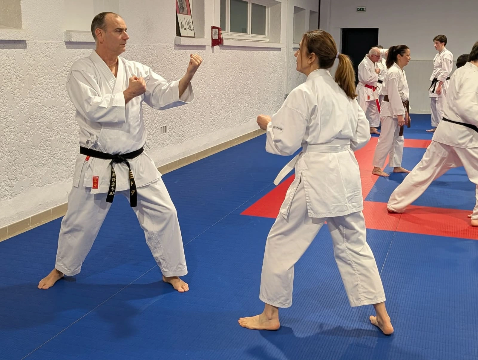 Les exercices proposés ont ensuite évolué vers un travail à deux, permettant d’explorer différentes applications issues des katas. L’accent a été mis sur la fluidité du mouvement, le relâchement et la justesse des trajectoires. Ce travail en binôme a permis aux participants de mieux comprendre le sens des techniques tout en développant leur timing et leur contrôle.